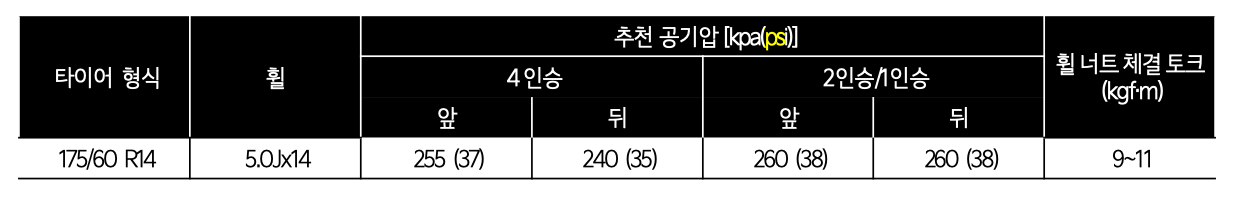 175/60 R14형식 5.0J X 14, 2인승일경우 앞 38psi, 뒤 38psi의 공기압을 추천합니다.