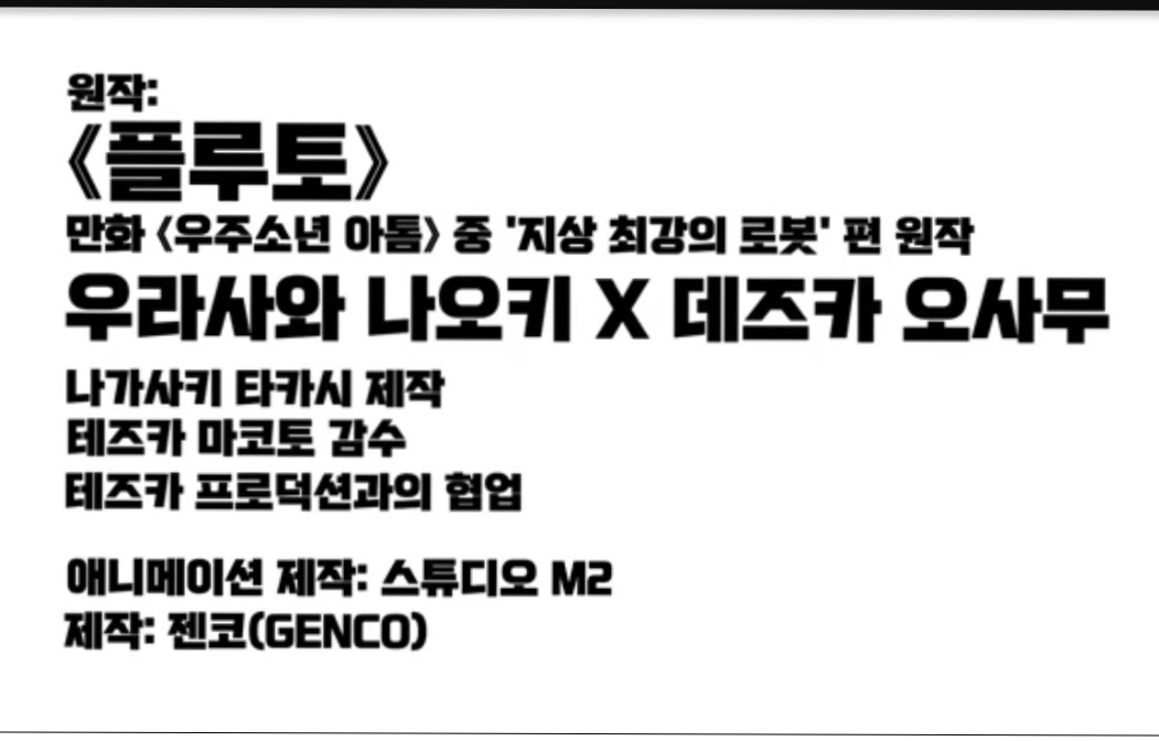 아톰의 세계관을 우라사와나오키가 본인의 스타일로 풀어냈다고 보면 된다. 플루토 만화 자체가 많은 상을 받은 작품이어서 스토리나 철학적 내용등은 의심할 여지 없이 재미있을것인데..애니는...