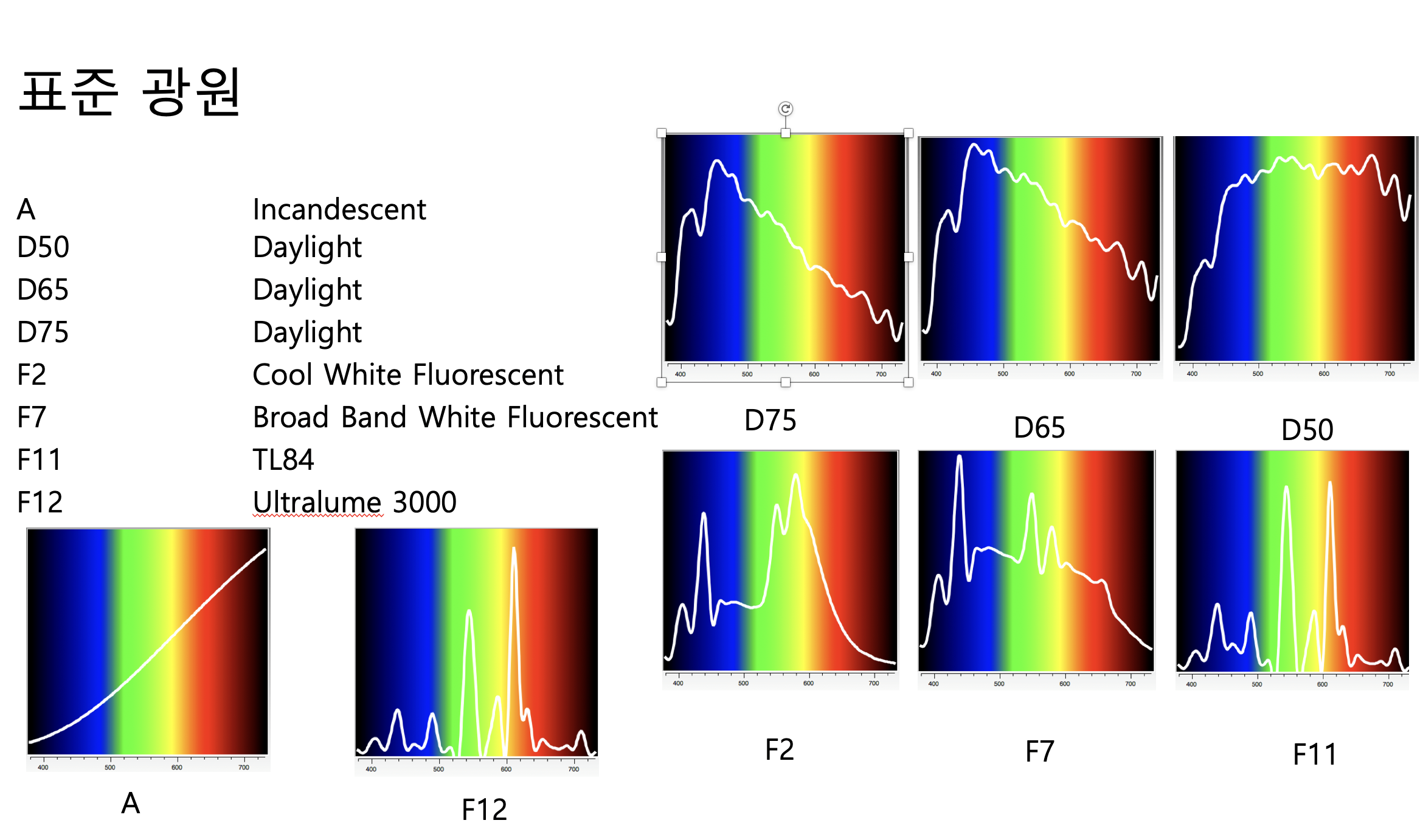 교육할 때 사용하던 자료를 가져왔다. 우선 표준 광원이라고 해서 정리한 광원들이다. F가 들어가는 광원은 더 있긴 한데 우리는 굳이 알 필요는 없다. 특히 인쇄 및 패키징이면 2가지만 알면 되긴 한다. 우선 뒤의 배경이 되는 파장은 380nm~420nm까지 표현한 것이다. 만약 빛이 없다면 흰 선 그래프 곡선은 하단으로 가로줄이 표시가 될 것이다. 여기서 우리가 봐야 할 것은 D가 붙은 광원들이다. 다른 광원들에 비해 매우 고른 파장을 지니고 있다. D50, D65, D75이며 그 외의 표준 광원들은 (A 광원 제외) RGB 삼파장의 등이라고 보면 된다. 강한 파장들이 보면 RED, GREEN, BLUE로 강하게 피크가 떠 있는 것을 볼 수 있다. A의 경우는 우리가 흔히 말하는 백열등이다. 그럼 D50, D65, D75는 왜 이렇게 고른 파장일까? D가 Daylight 즉 태양 광원을 의미한다. 태양 광원이기 때문에 다른 광원들과는 다른 고른 파장을 가지고 있다. 자 저 광원만 보더라도 어느 빛에서 봐야 우리가 올바른 컬러를 볼 수 있는지 바로 알 수 있지 않을까? 당연히 풍부한 파장을 가지고 있는 광원에서 컬러를 봐야 큰 오류가 없이 파악할 수 있을 것이다. 그래서 해외에선 국내에 패키지 및 섬유, 자동차 등 관련 일을 줄 때 저런 표준 광원을 시뮬레이션해놓으라고 요구하는 경우가 많다. 왜냐하면 어느 곳이든 동일한 조건에서 컬러를 판단하게 하려고 하기 위합니다. 그래서 사용하는 것들이 표준 광원 라이팅 부스이다.
