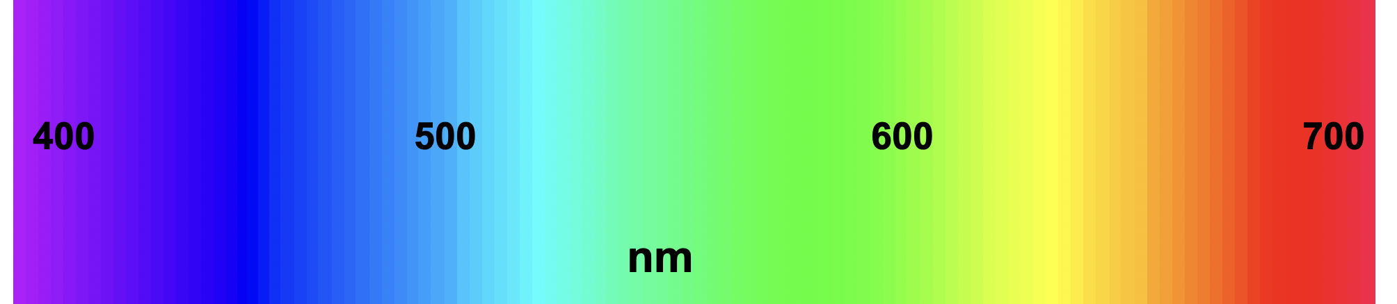 가장 고른 빛의 파장 에너지를 가지고 있는 완벽한 빛은? 바로 태양 빛이다. 앞에서도 설명한 것 처럼 컬러를 판단할 때 제일 좋은 것이 태양 빛이라고 보면 된다. 지금까지도 완벽하게 태양 빛을 시뮬레이션하는 빛은 없다. 그럼 태양 빛은 어떤 빛의 소스를 가지고 있을까? 앞서 살짝 언급했는데 빨주노초파남보, 무지개색이다. 하지만 우린 유식한 척 해야하기 때문에 다음과 같이 알고 있어야 한다. 태양 빛은 사람이 볼 수 있는 400nm~700nm의 파장을 가지고 있다.