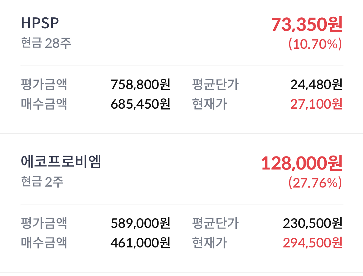 현재 유심히 보고 소액 투자하고 있는 것이 HPSP, 에코프로 비엠.