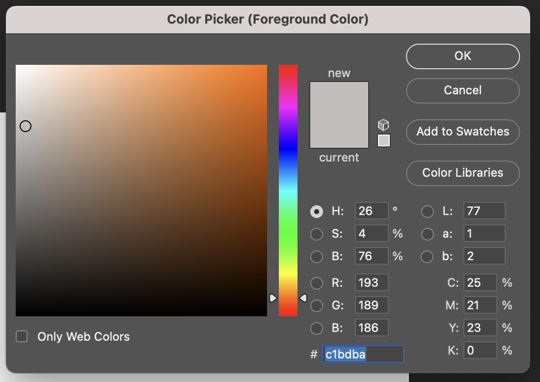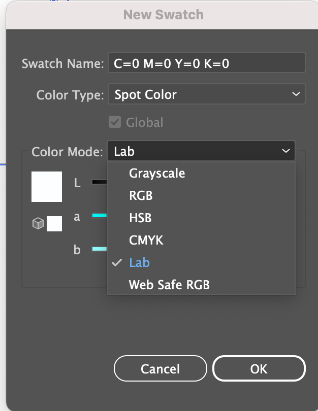 위의 이미지를 보면 포토샵 일러스트에서 스와치(별색)를 만들 때 Lab로 설정할 수 있다. 즉 별색을 지정할 때 사용을 할 수 있다. 그리고 포토샵에서는 컬러 피커 메뉴에서도 사용이 가능하다.