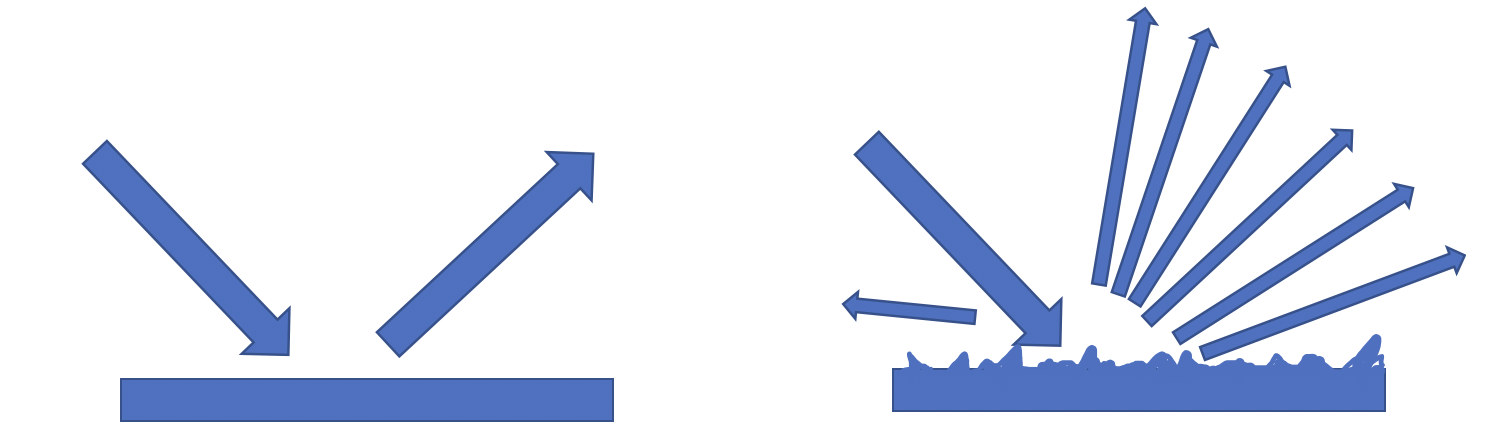디자인 분야에 관련된 내용으로 생각하면 정반사와 난반사가 나는 물체가 우리와 제일 관련 있을 듯하다. 정반사인 물체, 난반사인 물체 무엇이 있을까? 아주 간단하게 생각해보자. 현업에서 자주 나오는 말이 있다. 동일한 잉크 동일한 농도로 인쇄를 했는데 소제가 메트지일경우와 글로시지일 경우 다른 느낌(?)이 나는 경우를 말한다. 그 느낌의 이유는 정반사와 난반사의 이유이다.