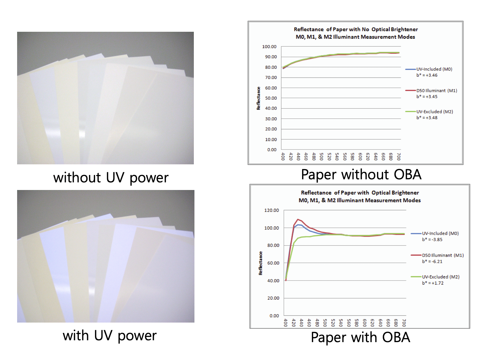 예전에 교육 자료로 받았던 자료인데. 문제 생기면 삭제를... 동일한 종이이지만 UV 광을 비추면 저렇게 파란빛이 올라온다. 유식한 말로 풀어 쓰면 사람이 볼 수 있는 400nm~700nm의 파장에서 400nm 부근에서 파장에 영향을 미치게 된다. 오른쪽 그래프를 보면 광원에 따라 다르게 읽혔다는 것을 볼 수 있다. 정확하게 계측장비로 측정을 한 부분인데 그건 나중에 이야기할 부분이어서 이 정도까지만 하려고 한다.