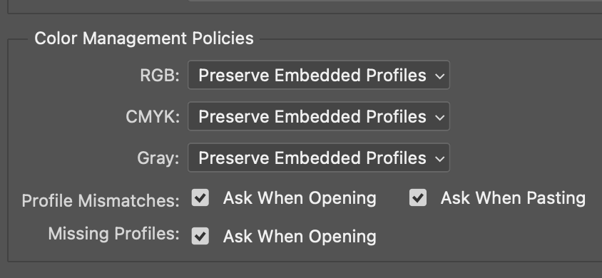 하지만 이를 사전에 방지할 수 있는 설정이 있다. 바로 하단에 있는 Profile Mismatches와 Missing Profiles를 체크하는 것이다. 이 기능은 내가 사용하는 색공간과 파일에 적용되어 있는 프로파일이 다를 경우 알람을 주는 것으로 하나는 파일을 열 때, 하나는 파일을 붙여 넣기 할 때 주는 알람이다. 포토샵 일러스트에 동일하게 기능이 있다. 이를 설정하면 파일을 열 때 프로파일이 다르거나 없을 때 알람을 알려주어 데이터가 오염되거나 컨버팅 되는 일을 사전에 막을 수 있다.