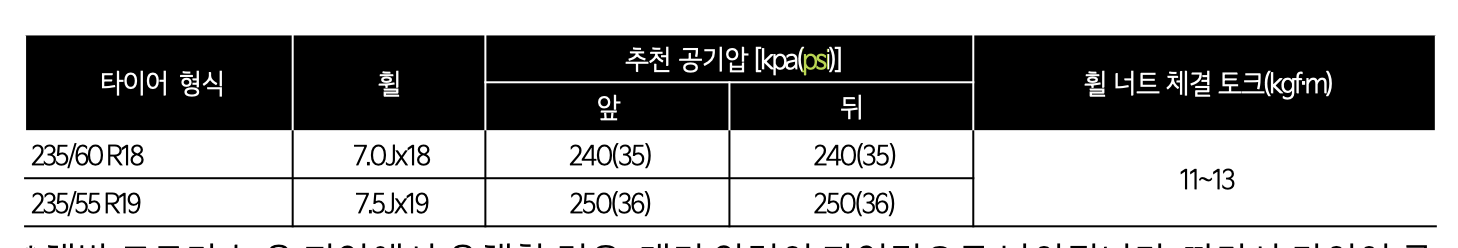 235/55 R19형식 휠은 7.5J X 19 의 경우 36psi, 뒤 36psi 의 공기압을 추천합니다.