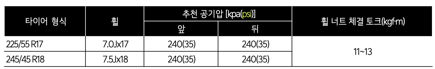 225/55 R17형식 7.0J X 17의 경우 앞 35psi, 뒤 35 psi