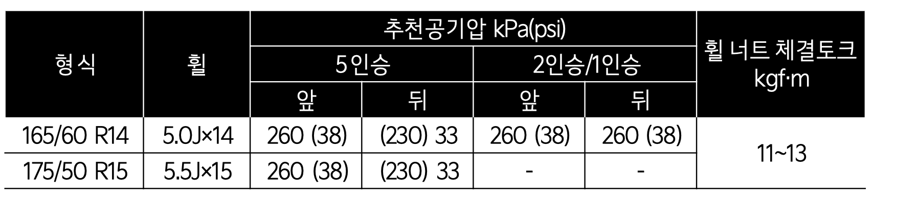 165/60 R14형식 5.0J X 14 5인승 의 경우 앞 psi 38psi, 뒤 33 psi