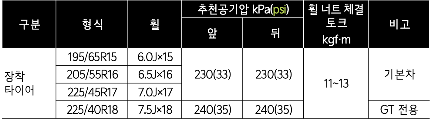 195/65 R15형식 6.0J X 15의 경우 앞 33psi, 뒤 33 psi