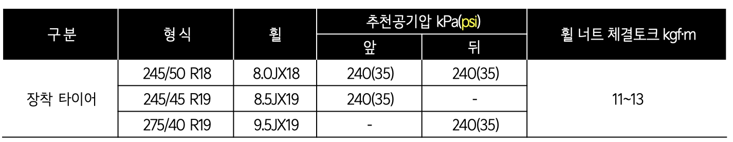 245/50 R18형식 8.0J X 18의 경우 앞 35psi, 뒤 35 psi