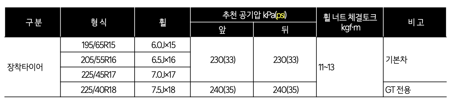 225/40 R18형식 7.5J X 18(GT전용)의 경우는 앞 35psi, 뒤 35psi의 공기압을 추천합니다.