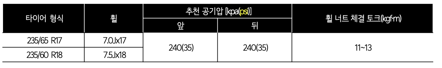 235/65 R17형식 7.0J X 17의 경우 앞 35psi, 뒤 35psi